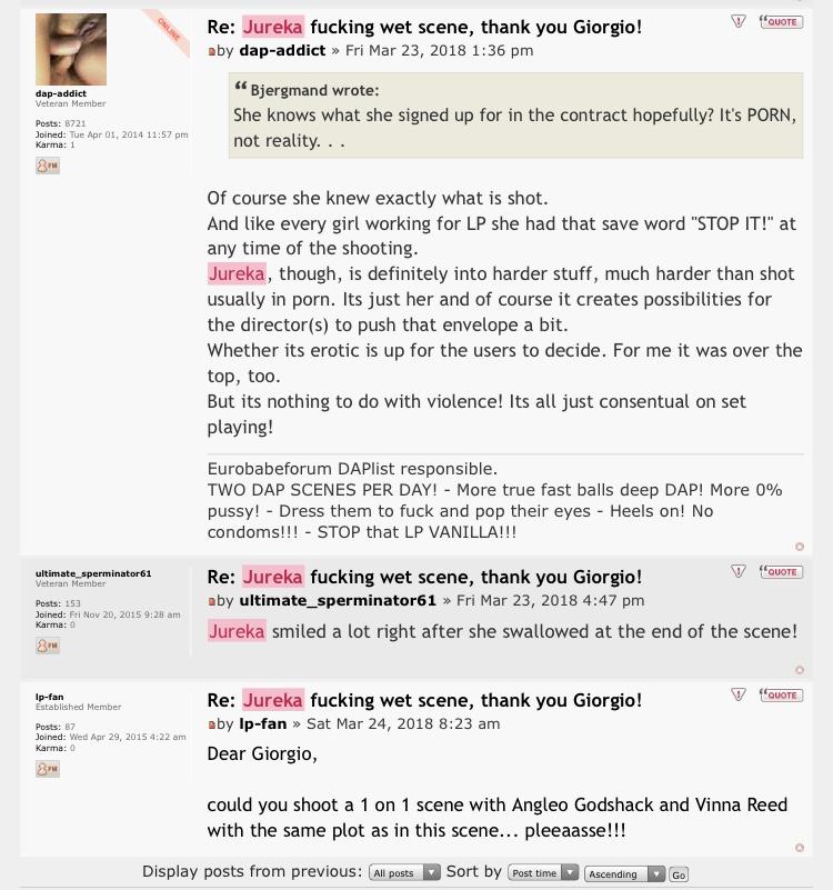 JohnnyMcSpunkencock wrote:TDD with Jureka Del Mar Almost All DAP / TP / TAP / Tunnel Vision / Big Gape / Swallow GIO521