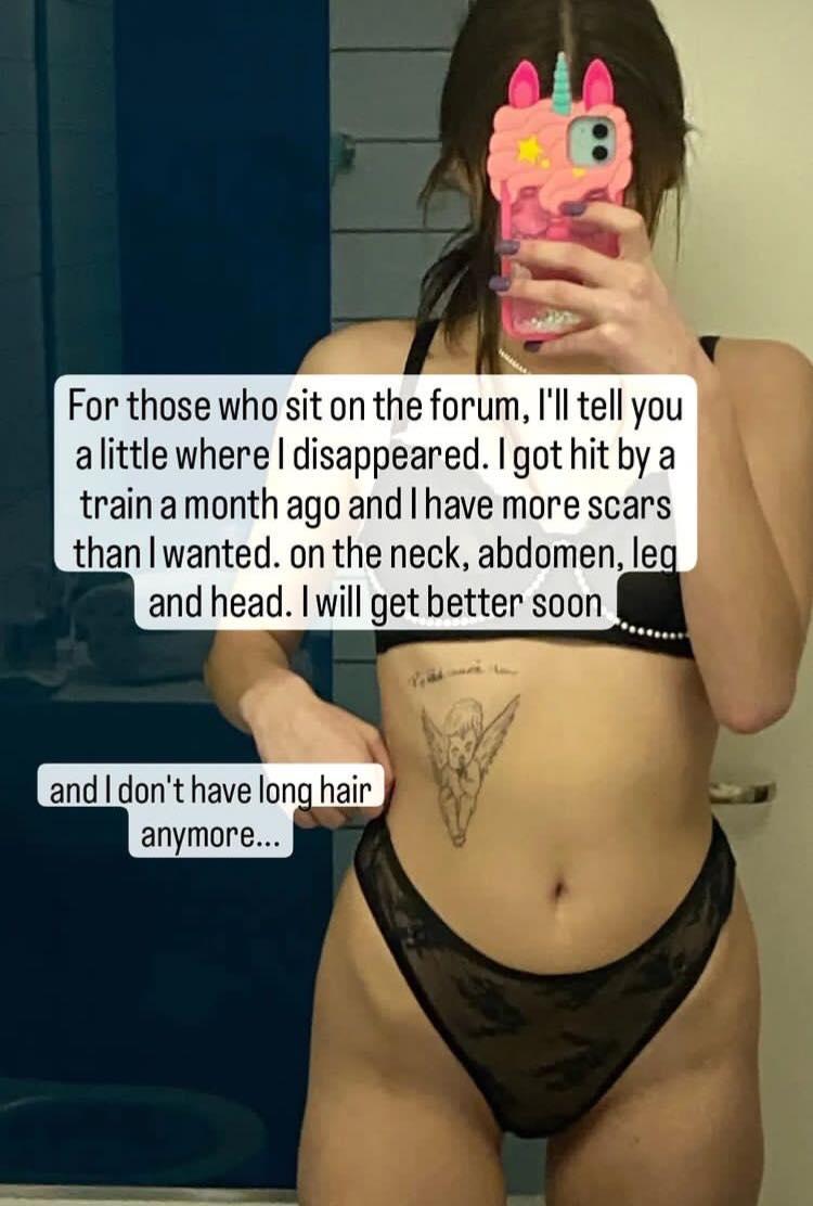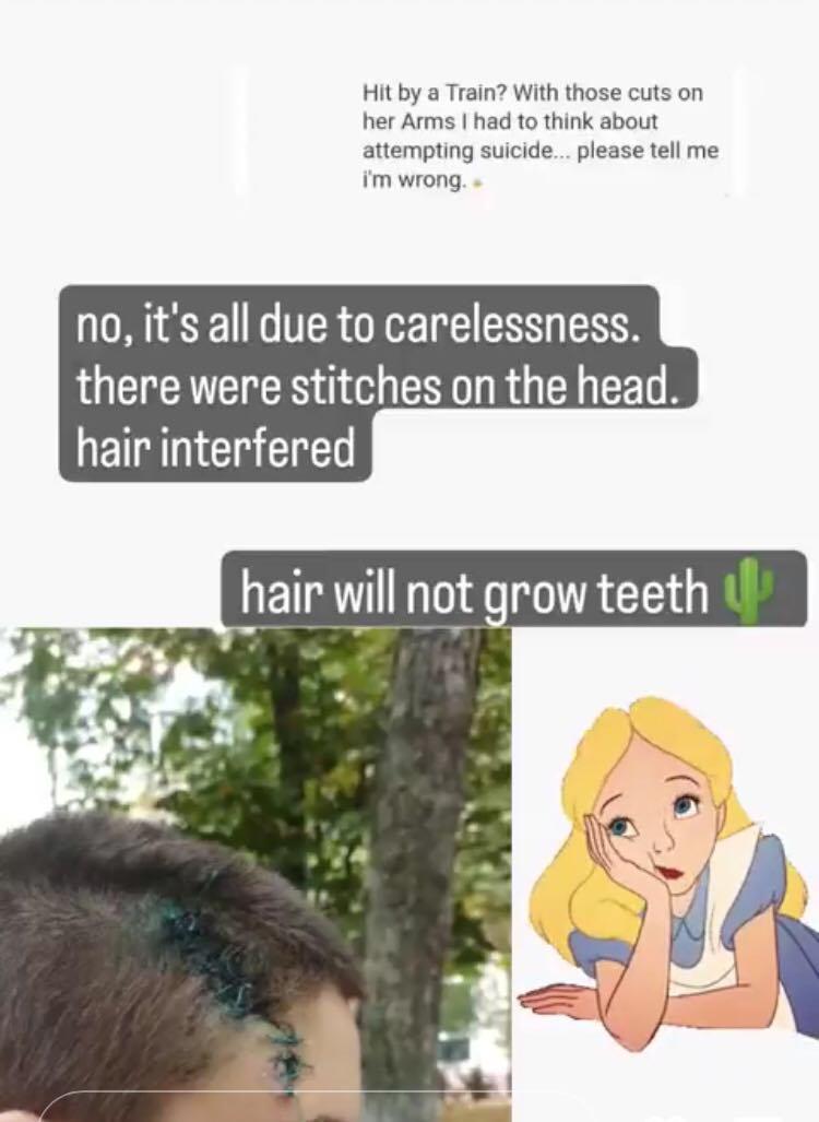 Hit by a Train? With those cuts on her Arms I had to think about attempting suicide... please tell me i'm wrong. :(
