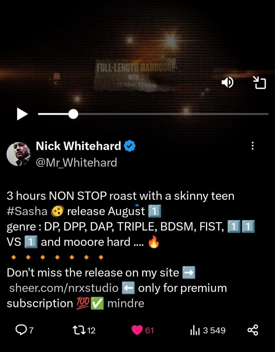 DPraved wrote:Nick has been advertising for an upcoming release on August 1. Over 3 HOURSof Sasha getting fucked every way imaginable by up to 11 guys; DP, DAP, DVP, TP, BDSM, fisting, pissing, you name it.