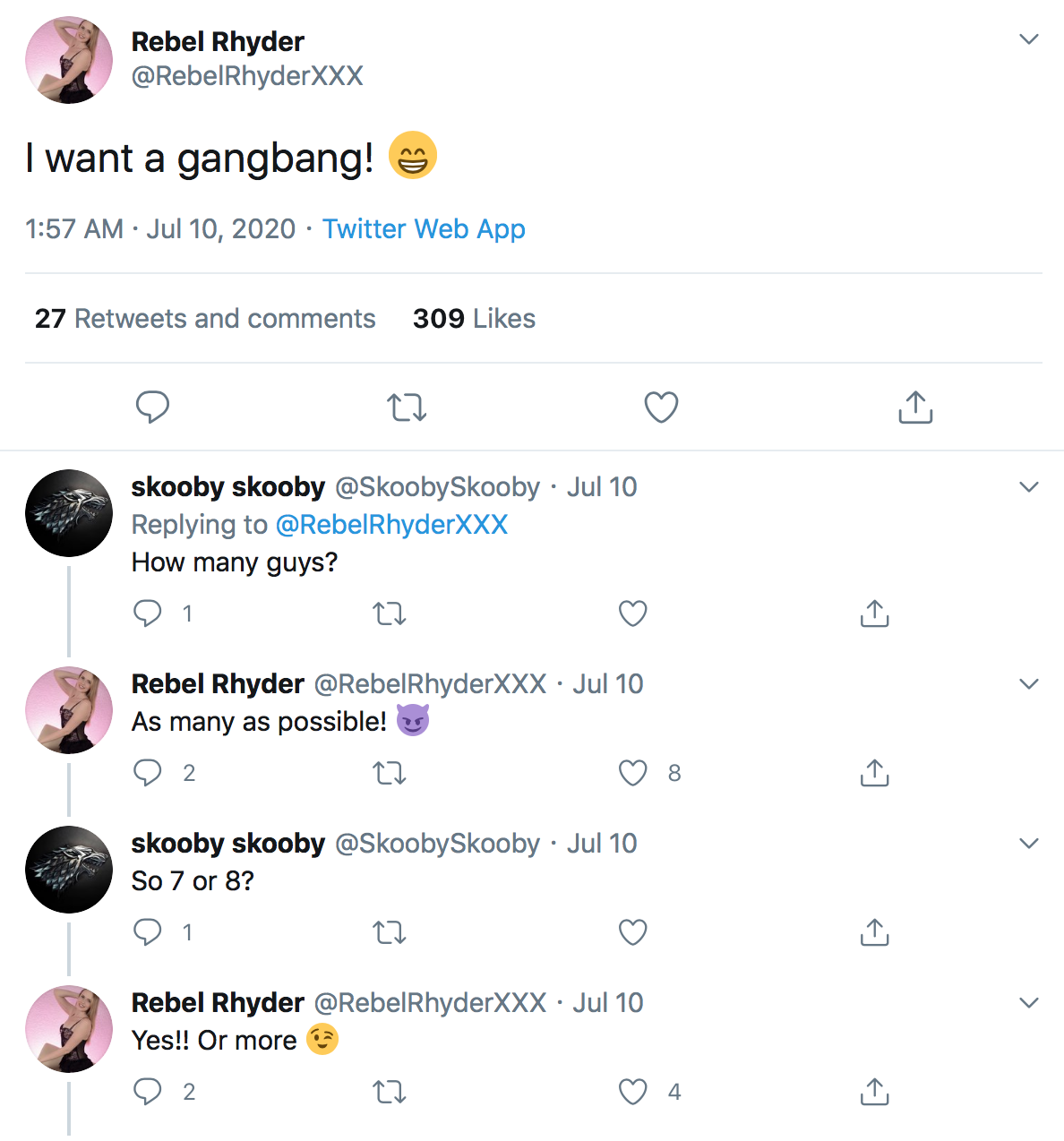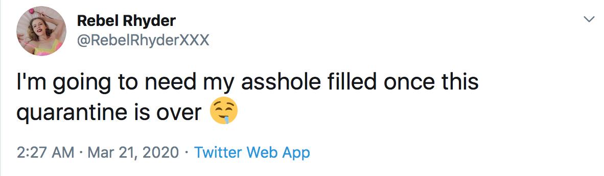 Rebel Rhyder? ?@RebelRhyderXXX April 18 2020 wrote:Slap my face, spit on me, choke me, pull my hair...use me like the slut I am, and I promise I will be smiling after. Nothing makes me happier than being used