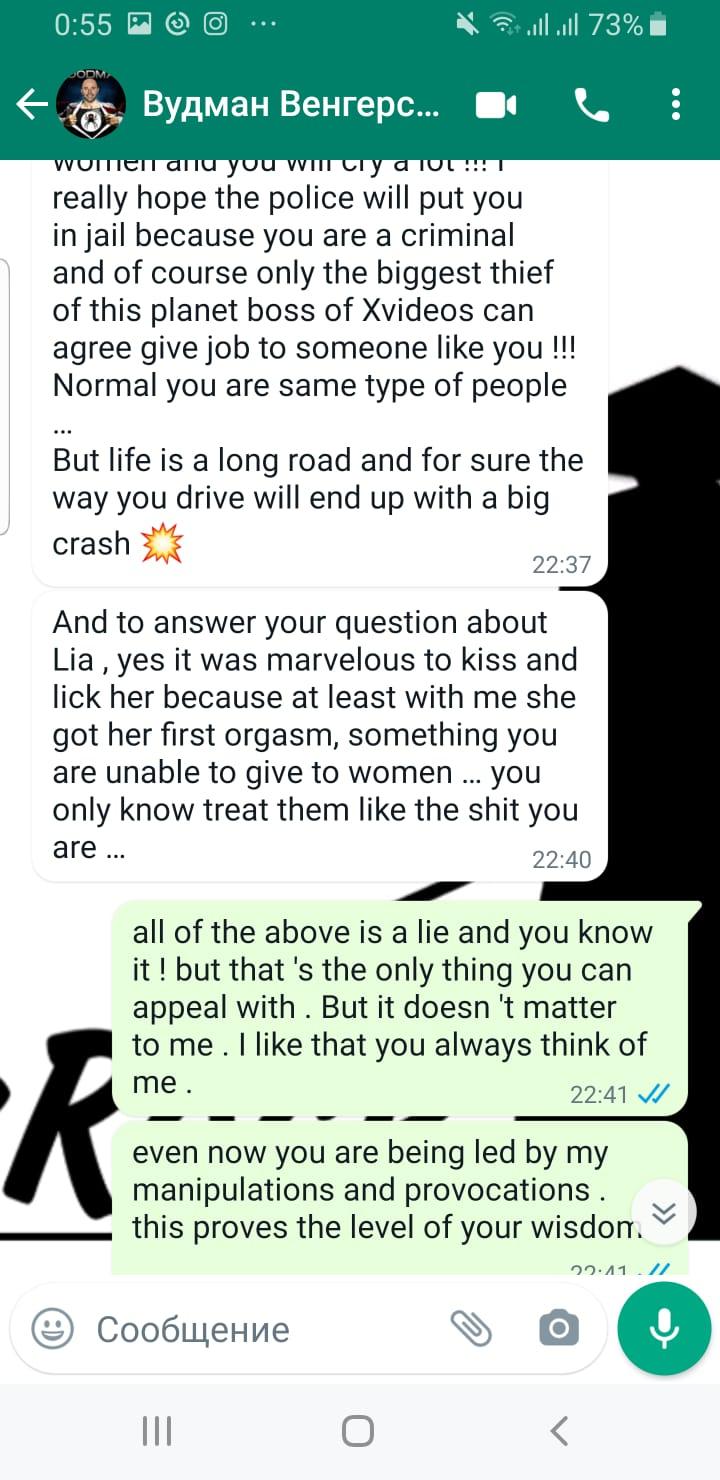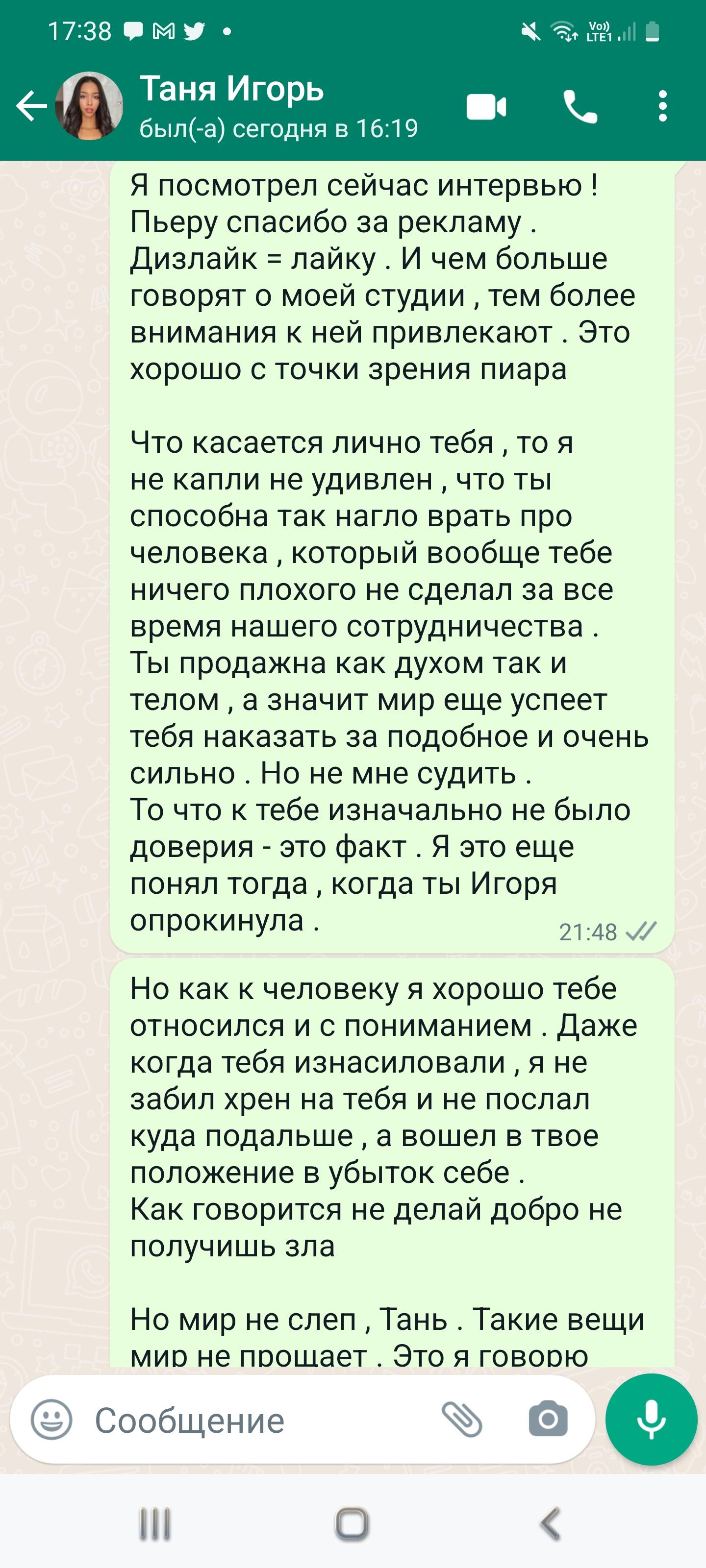 I heard that you wrote bad things about me when you saw the casting of Pierre Woodman with Lialin . You do understand that this is a fiction , right ? Pierre paid Li a to say bad things about me and about my studio . do you know why ? Pierre hates me and the Boss of Legal Porn . Lia corrupt . it is worth paying her money and she is ready to say bad things about you ! Now will be the moment of climax ... and your eyes will open ! and you will see that everything Lia said is a lie under the patronage of Pierre ! Below I will provide you with screenshots of the correspondence with Li a. you will see that my studio took care of Leah and helped her always . even when she was sick and when she was raped in a hotel ! my studio helped her and pulled her out of a moral hole . But of course she didn 't say that in the interview . she 's just a terrible person . there is such an expression " do not do good and you will not get evil . " in my case, this is very relevant