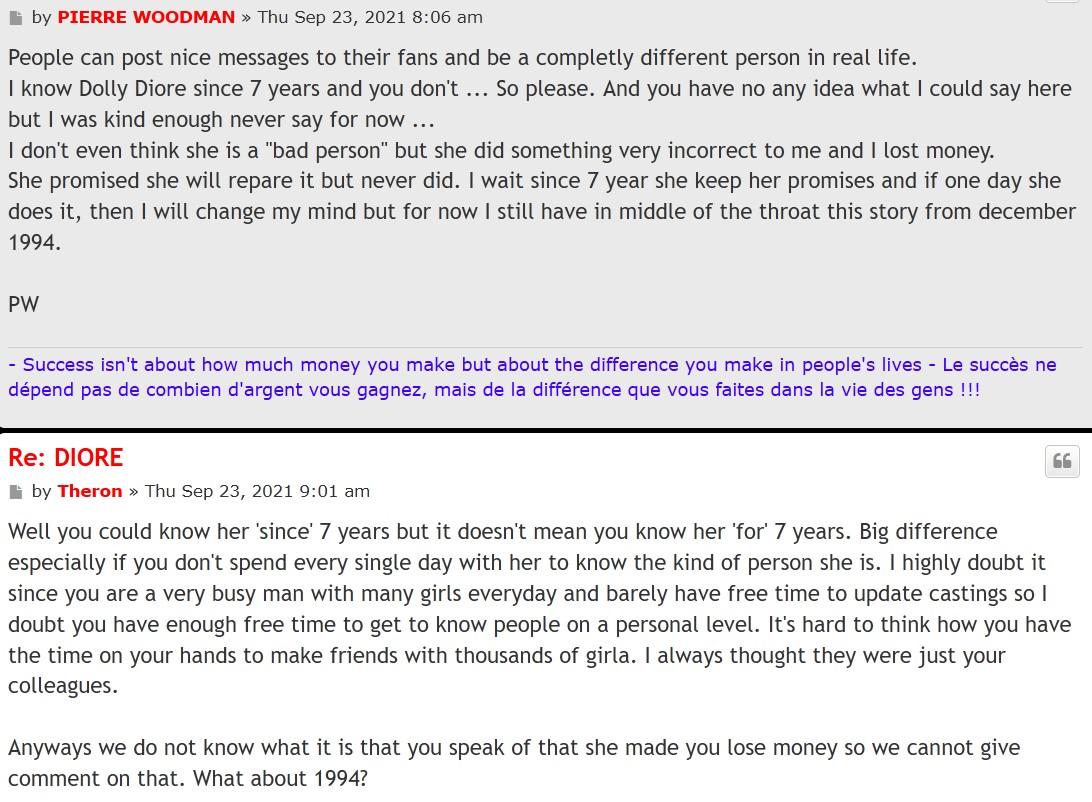 I ask you both "Julieheels" and "Durex88" (who I may have judged incorrectly earlier) to think about the person you talked to. That wasn't one of Pierre Woodman posts telling you how good or bad someone was, you actually talked to Diore and found her to be a very nice and intelligent person. You both almost capitulated to Woodman's replies to both of you denouncing the woman you spoke to. Can you not see that this man only wants you to see what he sees?? The only models who are worth anything to him (good girls) are the ones that he can or has manipulated, anyone else and I mean ANYONE, is not worth his time. If Diore was as bad as Woodman made out, do you think she would have taken the time to speak to you kindly Durex88? NO. And Julie, if Diore was so financially motivated do you think she would have turned down Pierre to do anal if he offered her the amounts of money WE KNOW he offers, but instead told you that she wanted it to be a "personal experience" which with Woodman it most certainly wouldn't have been? There comes a time when you have to ask yourself whether or not you are supporting the right type of person.