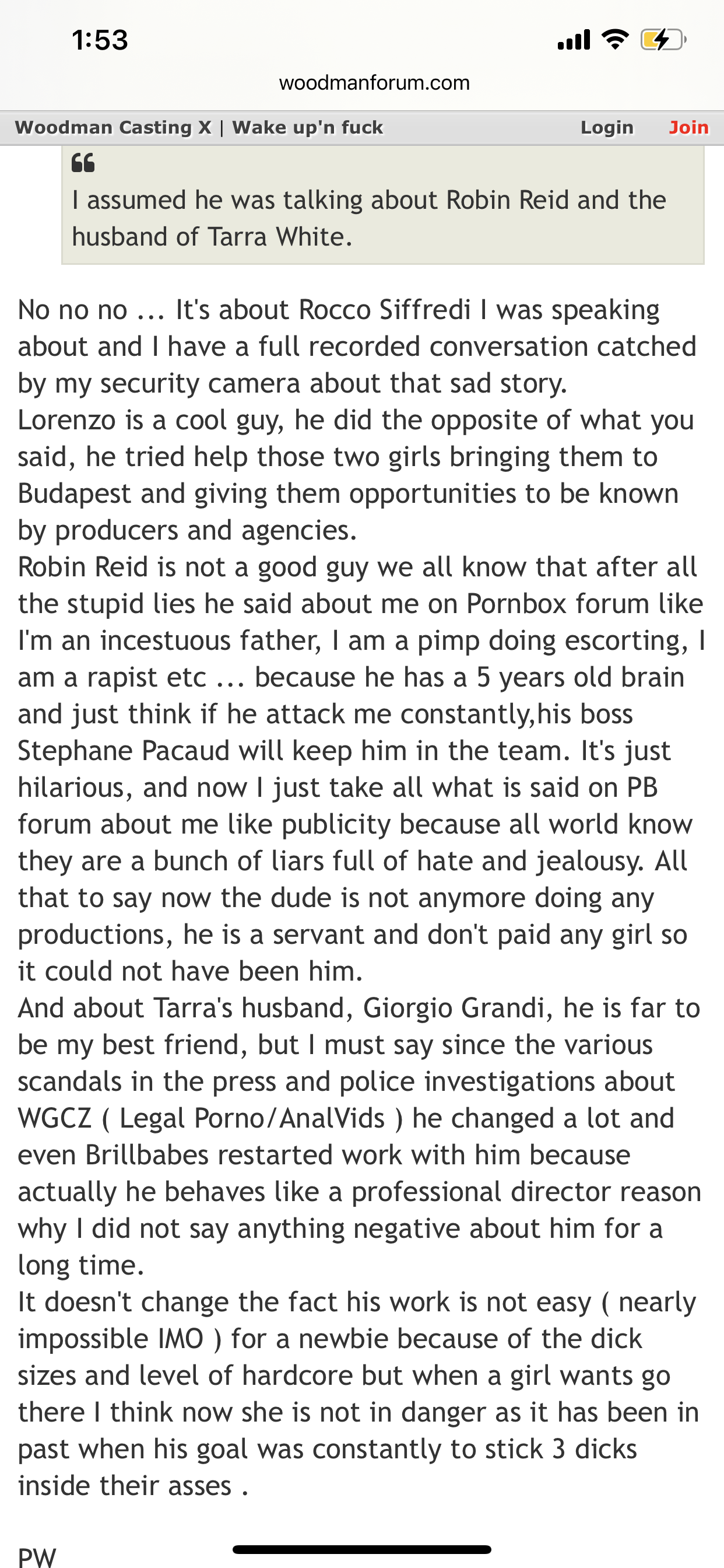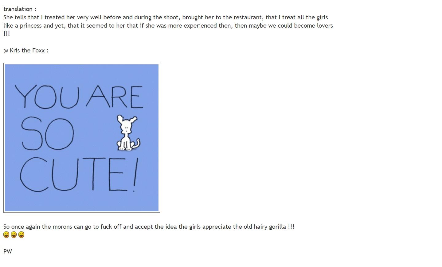 Oh but the egotistic and narcissitic nature of his next comment...Lol Jesus Christ! I don't think there is anyone in this world with such an inflated sense of self importance than PW. As if Virginy Lovely would not want to fuck any man besides your ugly hairy ape ass... he think he is Brad Pitt of porn industry. Man I literally fell off my chair he is so funny this guy.