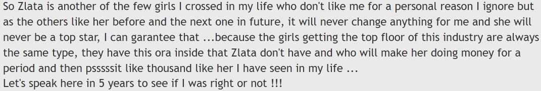 ValenciaCF wrote:Here's another perfect example of his jealousy and hatred towards others. The man literally cannot stand competitors who are by far better than him. He never misses the opportunity to try and brag about himself but off course he only speaks nonsense. He is obsessed and wants to be better than Rocco but he never will be. And when he said that Zlata wanted to work for him because he is non agressive I almost fell down laughing. The girl never wanted anything to do with you that's why he so mad about it. Now he make up lies she wanted to work for him and did the opposite that's why he don't like her. Off course it's a good point about ehy he always has problems wirh everyone including his ex friends Julia and Rocco. He is such a bad person. No wonder nobody likes him