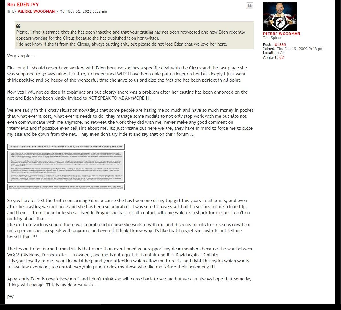 Valmont is the black sheep of that forum. One of the biggest ass kissers on there. Get one thing straight Valmont...Eden is not a stupid and neither is she manipulated by anyone or controlled by any dark force. You and your master should stop spreading false remarks. She is smart and can make her own decisions, uncontrolled by anyone, which is what your master does not like!!! She has her [spam] as well. She can work with who she wants. Nobody has influenced her so honestly just quit speaking rubbish.Time to accept that your master is full of pretense. The girls there are not there because they enjoy it. Ask yourselves why so many girls don't even retweet their work from Pierre Woodman. And these are not even girls from LP either. They don't consider him or his work professional. Many of them have traumatic experience. Did you not read the messages from Emma Hix??? And she is someone considered to be one of the most famous of the world. For sure your master will say she and other girls are making it up and show the manipulated messages to disguise the truth and hide the evidence. But here you have the direct messages of that conversation with Emma Hix. There are many girls who have been brutalized and even raped on his set. Go watch the Anna Taylor video where she is brought to tears and praying to God that the horror show ends. Or the Lex Lowe video where her rights were blatsnly taken away from her and she was violated on set. No discussion or consent to what was takimg place. She was forced into that situation and then blackmailed and brainwashed.