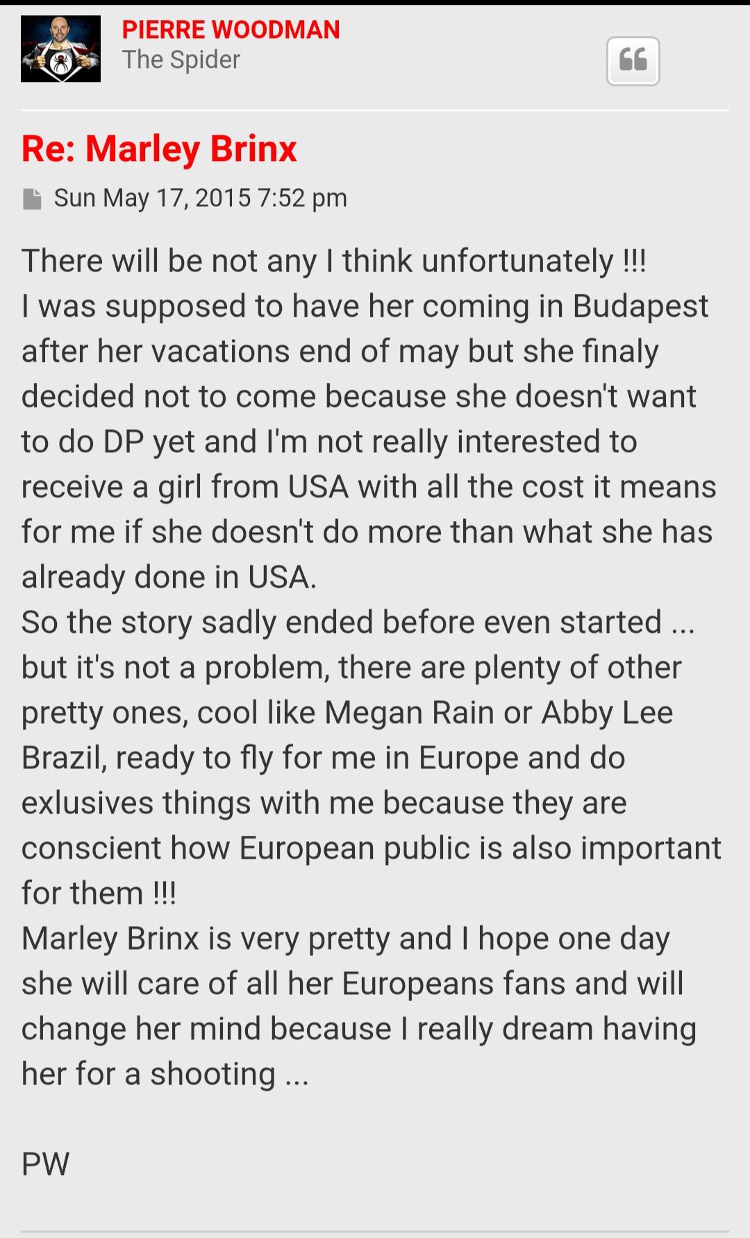 It's funny before booking her PW said he will not waste his time on Marley or other girls from other country if she is asking too much money and didn't give him anythimg more than she has already done( funny he took Eden Ivy who did all before). But then Marley posted her picture and said the reason why she did anal with PW was because it was alot of money...and we know how much he hate and talk bad about girls who do it for money purposes but he doesn't mention her main motivation was money.