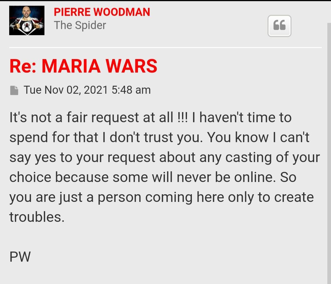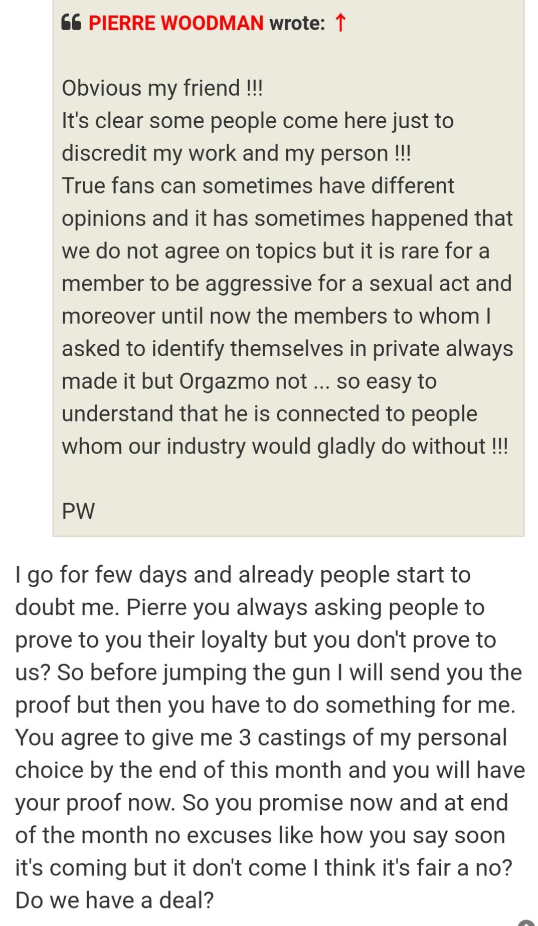 As for Valmont his henchman... what does he mean when he says that Orgazmo wanted 3 castings for free??? Orgazmo paid for his membership. He's entitled to ask for what he wants. Nothing is free. What's really insulting is that PW asked this guy to prove he is a member which I don't see any reasoning. Was he supposed to get more respect because he would have proved he was a member?. So PW treats human beings differently based if they are member or not? Money talks I guess. He speaks about trusting and not trusting so It's good that Orgazmo asked him because PW himself cannot be trusted. He makes promises to his memebrs which he doesn't deliver on so off course Orgazmo asked him to prove himself as well. He will prove his loyalty and in return PW prove he is a man of his word. Gentlemans agreement.Clearly not and he refused. don't see what Orgazmo did wrong to get banned. When Woodman feels he is in a corner he just bans members to escape sticky situations that he put himself in. Or he gets his henchmen like Valmont and Jean to help fight his battles