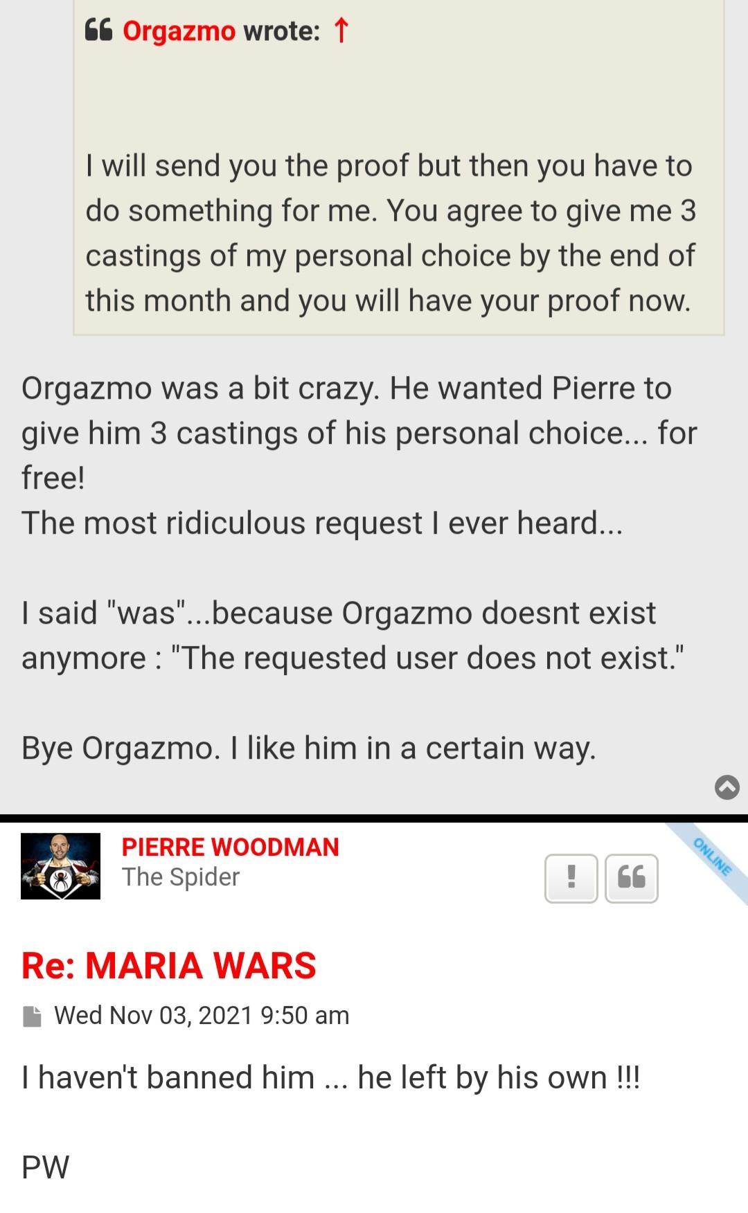 Well it's funny the blatant lies he speaks to his members. As being on his forum myself I'm pretty sure you cannot "leave" or ban yourself and cancel your profile by yourself from his forum. So if it says user does not exist then clearly he has banned Orgazmo after his comment. But he still has the audacity to lie that he didn't ban him lol. Funny because Orgazmo didn't look like he was going to leave on his own. He questioned his ethics, made a proposal, PW felt threatened, didn't like it. So he banned poor Orgazmo who will probably now revoke his membership to that clowns website.