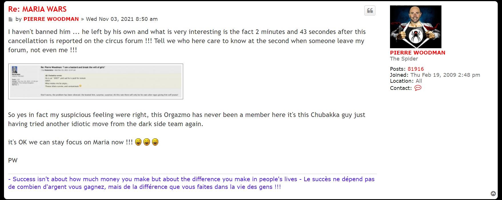Panorama wrote:Well, we must be getting through to some of his members Blue because he's brought out "Leslie Kaws" (Who I already suspected of being one of his alter-egos) to try and make the "circus" look bad. Personally Pierre I don't give a monkey's about your battle with the "circus" as I have nothing to do with them (and no disrespect to those allowing me to speak on here) all my efforts are to try and bring you down. I'm not going to lie and say the "circus" is better one way or the other I don't care. I saw what you do on your site, and it's you I want to see pay for all the wrong you've done over the years. I believe I can do that by being honest with your members, and I know more and more of them are looking at this forum. So please go right head and fetch out "Leslie" and god knows how many other alter-egos you've got to try and make yourself look better because your members aren't stupid it's not 1990 and they are well capable of working out just how big a fake you are.