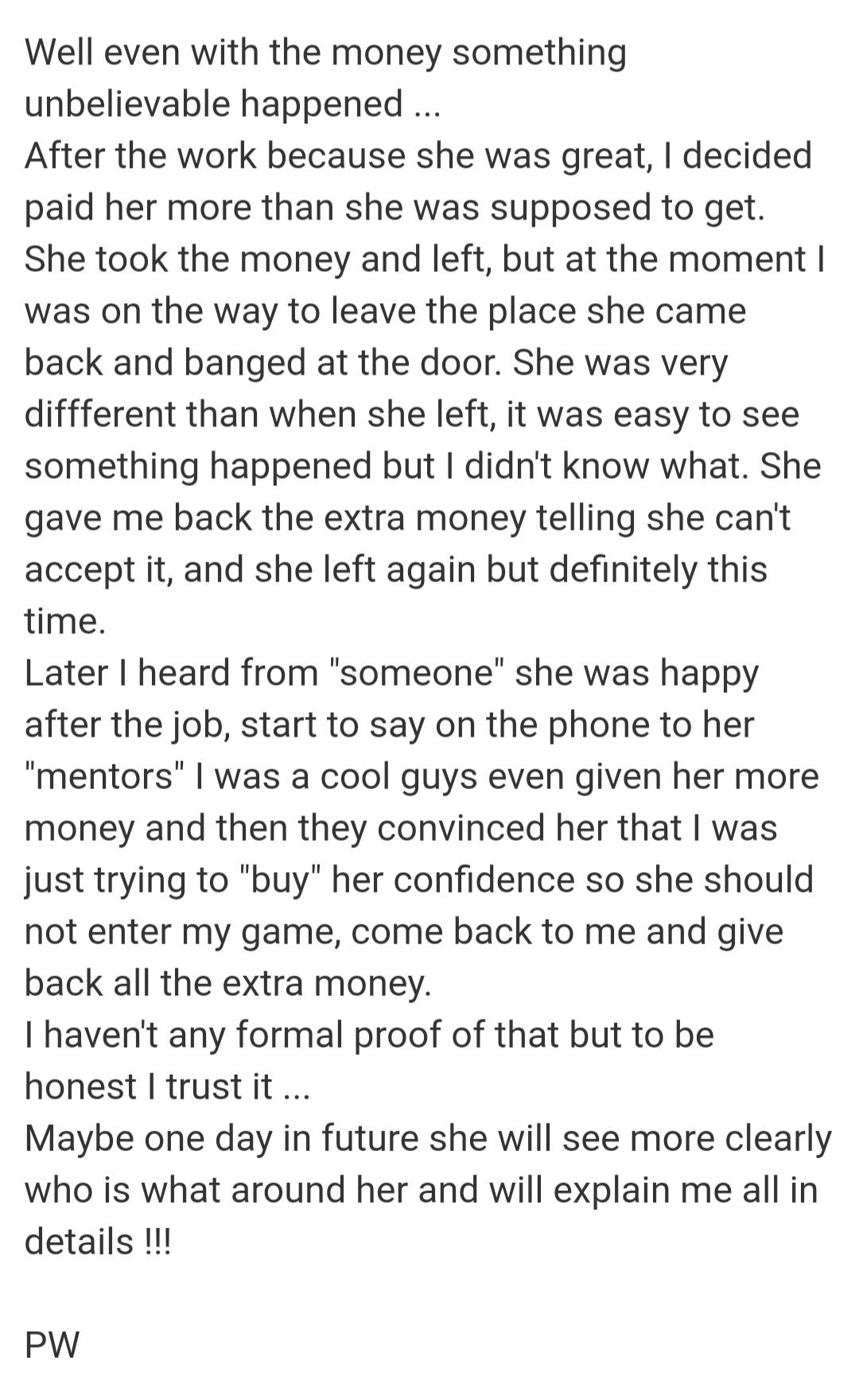I dont know this case, but it could actually also be as Bp lier APE claims that with him they actually do it for free, just because after that 1st anal for PW service PW puts them - and also the agency of that girl - into contact with his friends from his side (or main!) business in Paris and UAE and there the girl - only after servicing him for free for an alleged porn video - earns 20-50x as much or even more.