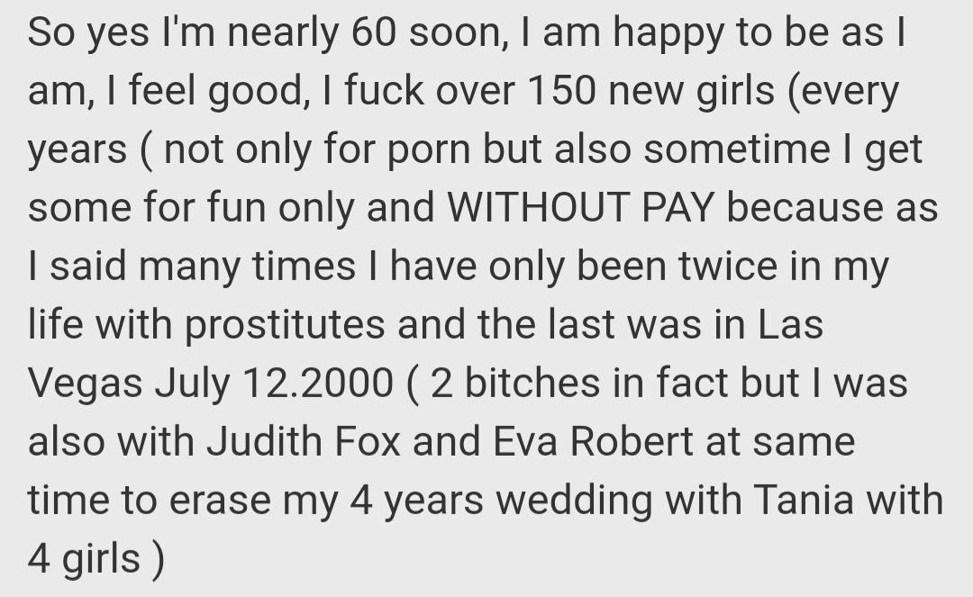 Well I am glad that he could not resist but to send a big post to try and defend himself because it shows how threatened he is and he have to keep his ego in tact. Like I said it's him who make himself look stupid now admitting that he has paid for prostitutes before and even Judith fox who he can talk alot of shit about now after she asked him to organise rape scene for her. Offcourse he also could not resist the temptation to talk shit about Tom cruise and George Clooney either lol telling they had surgery and he didn't. Because it's what he does.He like to make other people feel small amd himself like a King. He basks in his own self absorbed pathetic illusion of being better than everyone else. I suggest he focus on sorting his own erection problems because his cock can barely even get hard in his own videos. He can tell he have young girls sending him messages to fuck everyday but it's all lies and words. Because that's all he does is talk words and no action. Prove it then! Show your messages, just like you were going to show the Liz Rainbow proof when you got scared and locked the thread and showed nothing. You are worst than a woman thst can only habe big mouth amd no action. You are nothing but a coward. So yeah talk about how you fucked Judith the escort for free because you think people actually believe you. You fucked her ,paid her and called her "trash" because it's how you treat and disrespect girls and escorts. Nothing new.