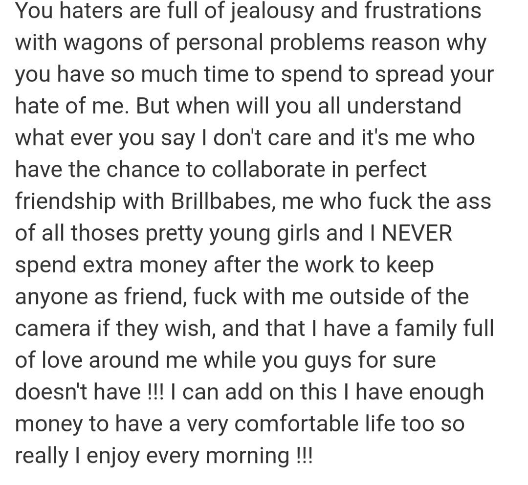 He doesn't spend extra money "after" because he puts all the money upfront like with escort. Everything paid upfront with bonus sonthey can fuck with him after. Strange how he don't mention how magically his friendship with Brillbabes is perfect as if their public dispute never happened. Wow! He don't talk about this. Let me guess. How he fixed it??? With money offcourse. I don't think he fucked Esther's ass to become friends. Certainly not. So how much you gave Brillbabes to beg them to continue giving the girls to you first? Lets hear your secret.