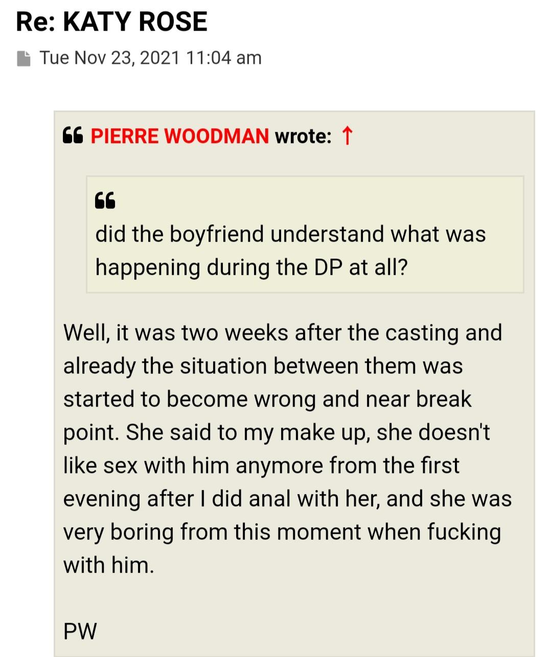 He is so delusional and egotistic to suggest he fucked Katy Rose in her ass so good that she forget to enjoy it with her BF anymore. Why would you go on a forum and say this. Like can you believe this idiot how far from reality he is. Not only by creating an ego boosting lie, but to disrespect her and her bf for saying sonething like that. I actually din't feel sorry at all that his wife was brought into this mess because he talk so much shit about other peoples wives and girlfriends but when its his own then he want to play the victim and cry.