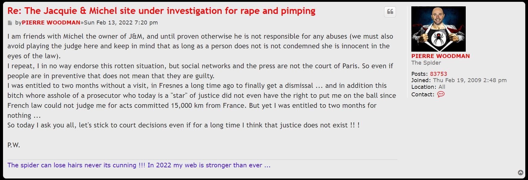 Well, you are right. I produced more than enough ammunition for the legal team of xxx/wgcz regarding a supposed upcoming legal case from Pierre Andre Nicolas Gerbier (also known as Pierre Woodman) where he filed complaints about various matters concerning: himself, his wife, his daughter, his brother, his male and female "friends", his son(s), who's ex- wife of multiple years got her shit fucked straight up the asshole on multiple occasions by Gerbier-, his newlyfound brainwashed "friend" Cayenne Klein and whoever the fuck he says that he needs to defend in court, him being a supposed scatman, a supposed animal porn lover, him being a supposed incest porn lover etc.