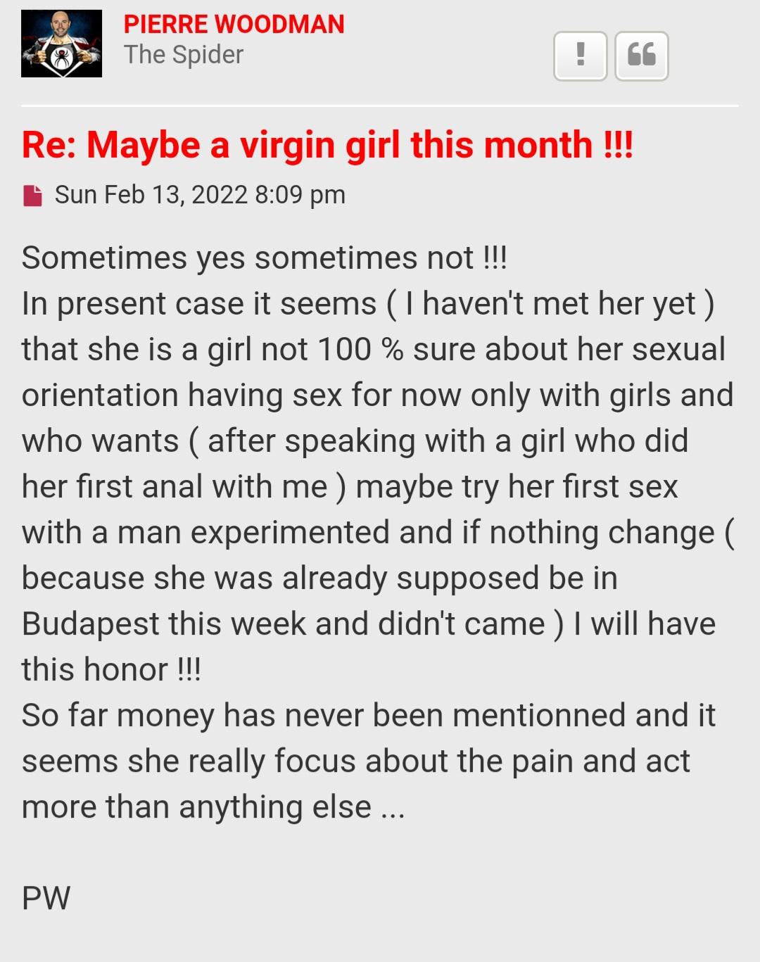 He keeps feeding his members bullshit, playing the storyteller and making hype that a lesbian girl not interested in money will come to him just to experiment to try sex first the first time with man. How big is his ego or how sruoid does he think people are? If a lesbian girl want to lose her virginity with a man, she will not go to an old, hairy ape like you. He try to make people believe that girls go to him for any other reason besides money lololol. Girls will ttavel to Budapest just for his lame,tiny dick lololol. He need to cone back to reality. She is probably another escort who will make 1 shooting with you and disappear