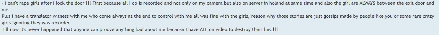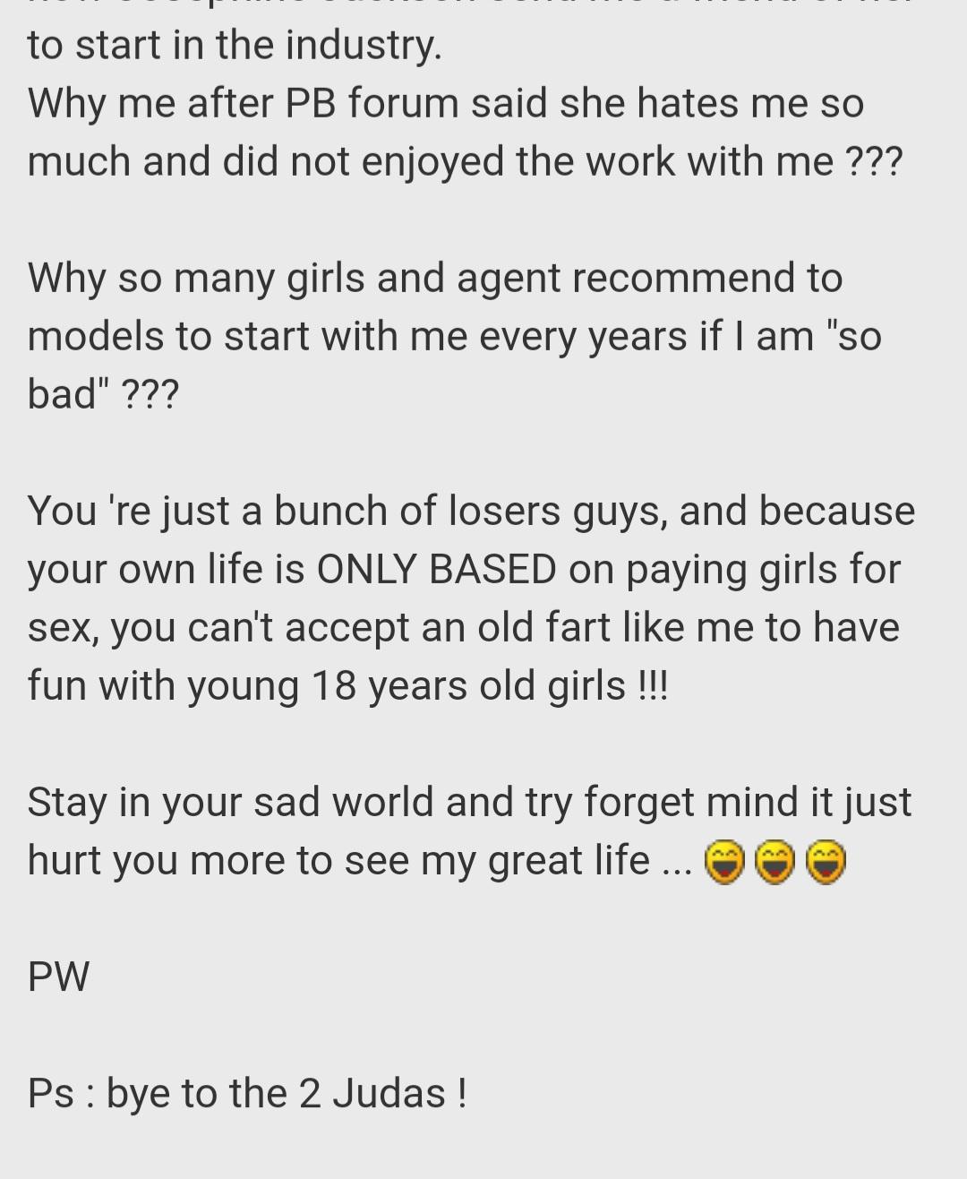 And second point...I don't understand why then in the same comment he tries to justify PW... (''he dont' treat me poorly in general...'' WTF it's mean?) because many are afraid of him? How much did she pay her to keep quiet and keep kissing his ass despite everything? Yes, she can't talk about other girls' experiences...but she would do well to talk about her own, who knows how many girls will regret...?