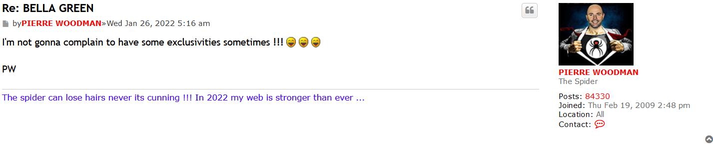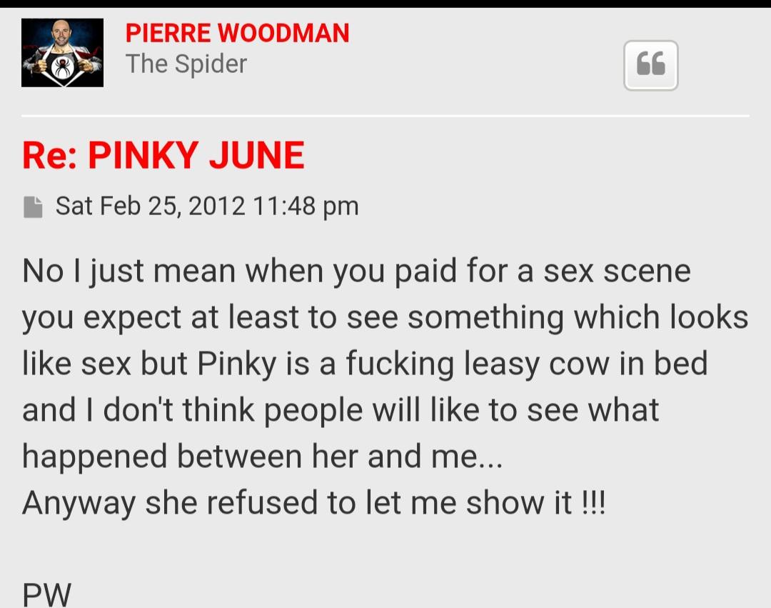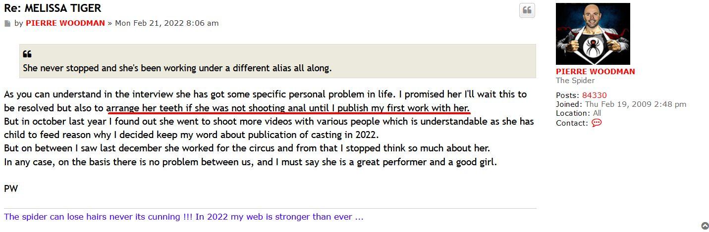And this is him trash talking another girl. This entire thread is dedicated to humiliating her and he blatantly laughs as he and his members make fun of her. This is classic Pierre Woodman and then he pretend he din't know why girls don't like him and don't want to meet him. They talk shit about you because they've seen your nasty ways and don't need to see you face to face to realize what a prick he is. calling girls "snail brains, schizophrenic and dumb leasy cows". He likes to pretend that people treat his family bad but watch how he humiliates this girl and her family himself, accepting photos of the girl and showing her newborn baby on the thread. Making pictures of the girls mother because ahe was also porn and calling her pimp,mocking her family and to think this asshole has the audacity to complain what people do to him when he's done it to hundreds if girls. Sending pictures to their family, blackmailing and causing them pain when he din't get what he want. He is a JOKE!!!
