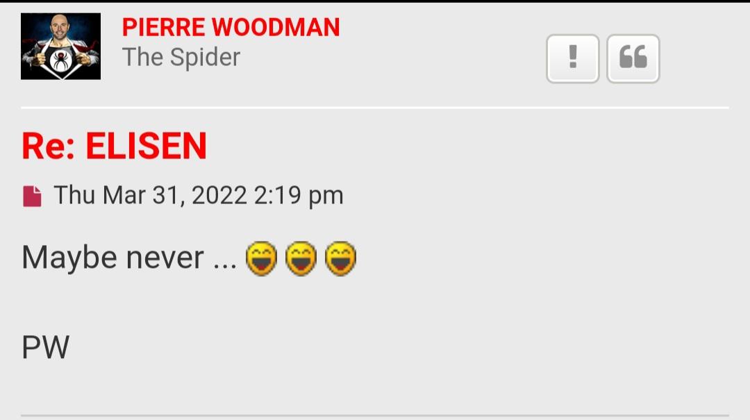 Again more VERY interesting information "Cgr69801QUvm_mYtbbqMt_r_p" I did suspect that "El Major" had been booted and Woodman had Zombified his mortal remains for his own uses. However, "El Major" seems to be back arguing with the other members. Although I really do believe that Woodman has many alter-egos, I also believe that there are genuine idiots out there who follow him probably more than the single-digit numbers you suggest but that's something I guess we'll never know. LIke you say, more often than not you can tell Woodman's style of writing and I've noticed a few members disappearing only to re-appear with a more favourable view of him.