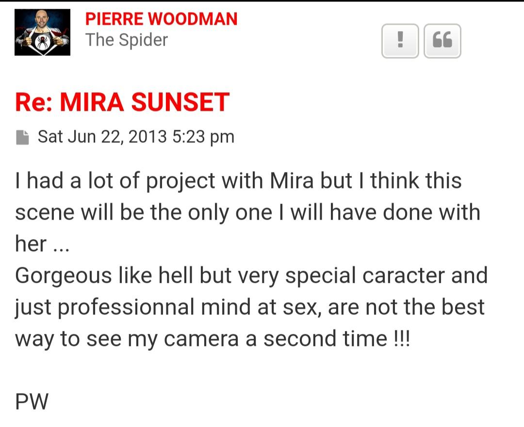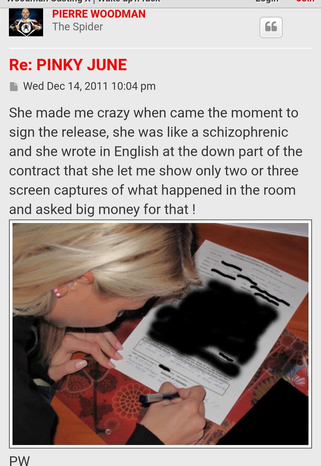 So, since she read the forum...If I can ask... how many hours did "Woodman" and the assistant psychologically pressure and manipulate you into doing something you didn't intended to do when you showed up to the "shoot"(and considering the poor mental health you already had, which you yourself admitted, it could not have been a pleasant experience)? How many times did you say "no"? And do you think this is normal behavior from a "producer"?