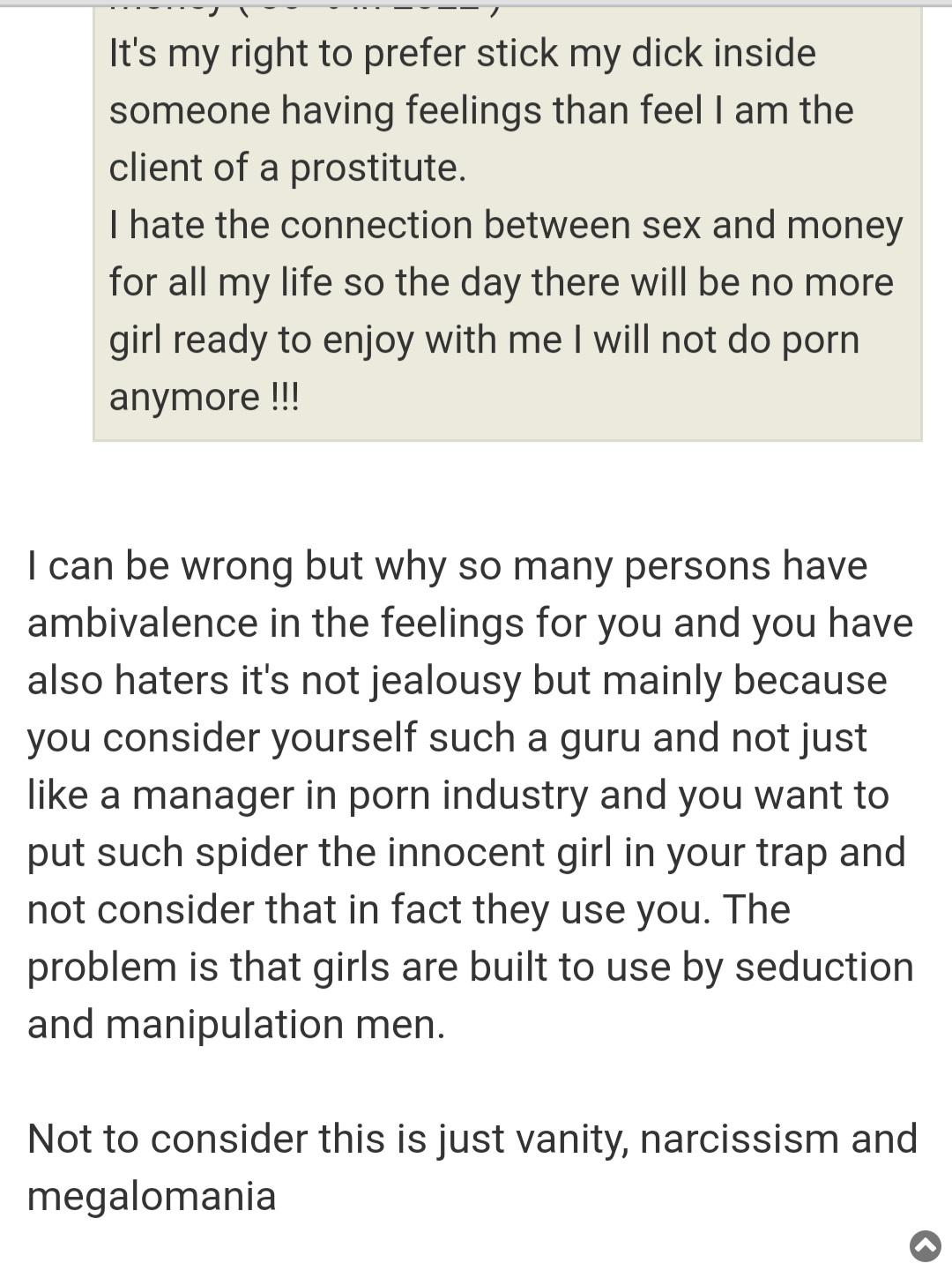 Unfortunately for him, this only proved how weak he is. An egomaniac who cannot handle one ounce of criticism or anyone elses opinion different to his. He is so paranoid that everyone who disagree with him is from LP forum so he kicks them lololol. His paranoia is off the charts. He's not capable of havimg a simple discussion from anyone who don't like his ways his ways and who tell him straight. Only a weak man does that.He want to look good to the public but everyone alredy know what kind of man he is. Callimg them bitches because they do porn for money and then he wonder why they don't want to go by him. What a lunatic. Nobody can have a civil adult conversation with him because he acts like a child. Watch how defensive gets and calls these two members losers for thinking the way they do and not agreeing with him even though there was no malice in what they said. What a petulant little child :D He should close that forum because he only talks to himself and with people who suit only his agenda.