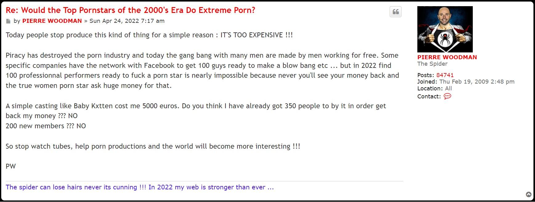 Panorama wrote:But on a serious note. I think you'll find that it isn't the tubes that "destroyed" porn Pierre........ In fact, porn hasn't been "destroyed" at all it's simply MOVED ON. Of course, being the dinosaur that you are, you however haven't, hence why you don't have 350 members to buy your now severely dated, poorly shot, poorly produced, poorly directed little flicks! The porn industry will always be interesting, it's just you that will always be Pierre Woodman, the "has been" porn director/producer/actor that will forever be remembered for the way he treated some of the internet's greatest models like whores.