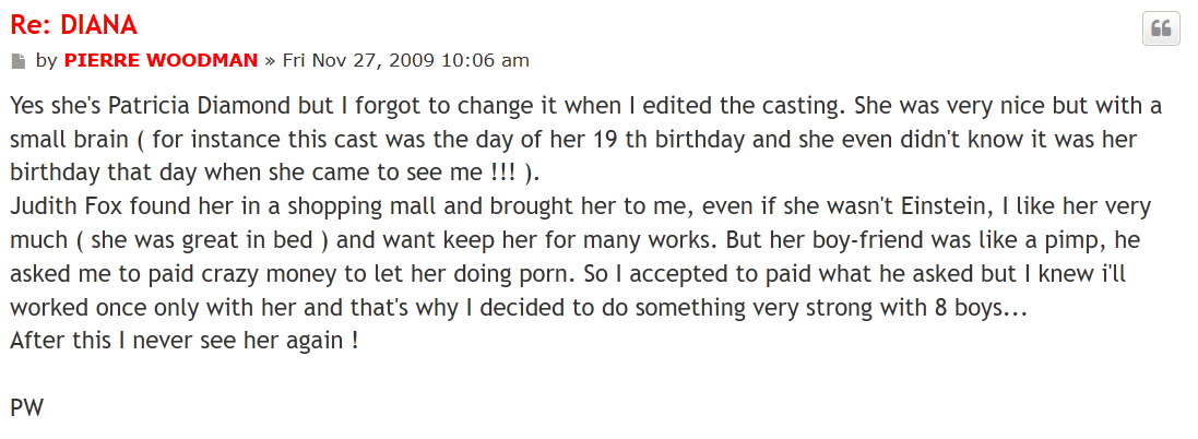 Then the usual bashing, ''small brain''...he knew he would only do one job with her so he putted on her 8 guys...the behavior of PW in his full glory from a 2009 exploiting girls. And all these years still no one has spit in this guy's face? Ah no, a girl spit on him said...too bad we'll never see it...that was escorting service.BlueShadow wrote:Can someone explain to me exactly what that means?