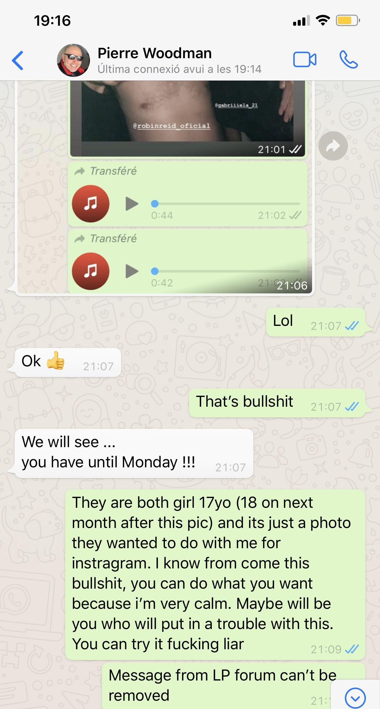 Le envié a woodman todas las fotos y conversaciones telefónicas sobre su caso en España con la menor.