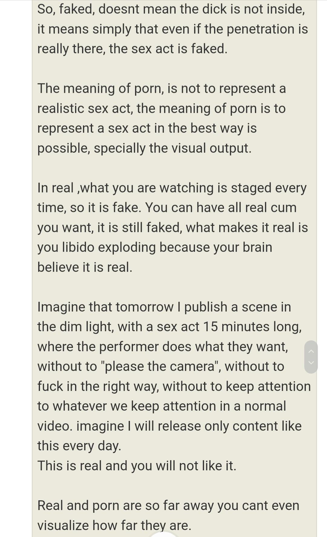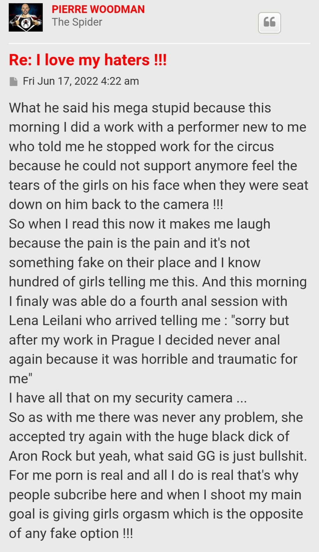 I love what GG said about porn not being real because he is right and what he explained makes proper logical sense. Porn is fantasy. It is not real but staged. Even if a girl enjoys herself it is still fake because what he was trying to explain is that there is no emotional connection between porn actors even if they enjoy sex on camera. It is just a physical feeling but this idiot Woodman still don't understand a girl can have orgasm in porn and still make fake porn because it's a natural reaction and most importantly It is a product being sold. A director directs the actress who plays her part. This is what PW never understands in that stupid brain of his and that is why he is so delusional in his way of thinking because he is not looking ro do his job. He just wants to trear pornstars like whores. This is a business where actress comes to fuck, get paid and go home. She doesn't care about your ugly,haory ass or orgasms which she can fake amd moan for the camera. If he's looking for pleasure he can open a brothel because what he does is not porn. He carries himself as a client looking for pleasure and not to run a business and be a director.He actually believes that models are there to have a good time with him just to satisfy his ego. Meanwhile girls sending messages and laughing about his small dick and complaining about the sex with him :D
