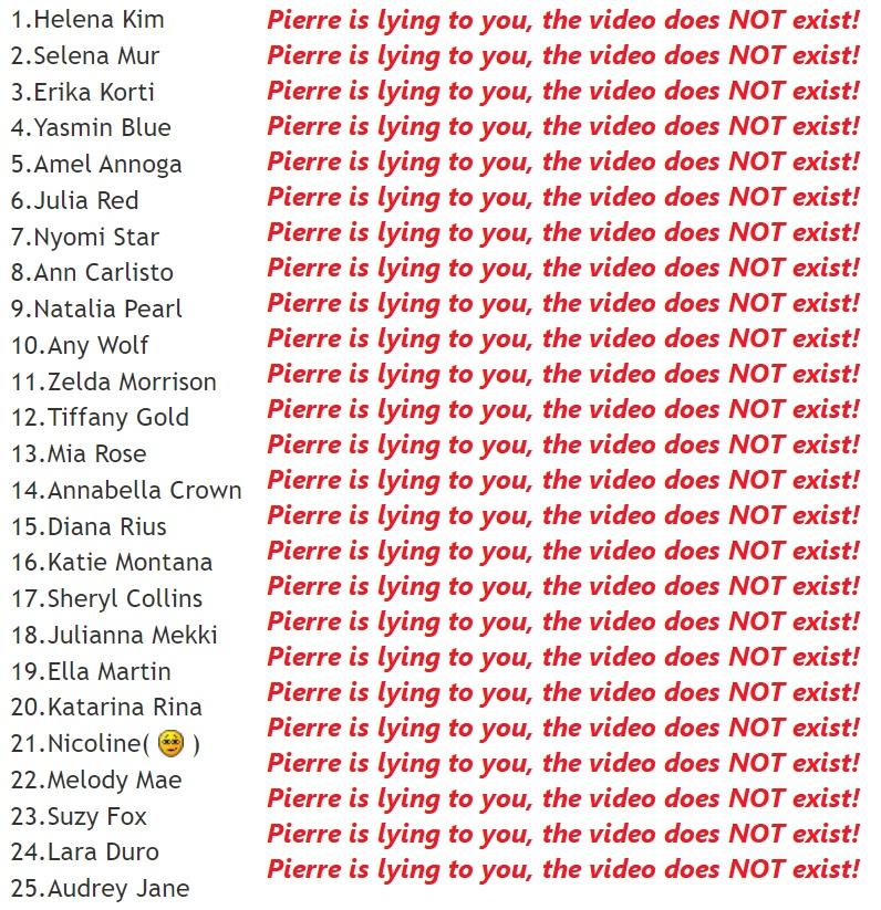 Pierre can prove once and for all that he's not lying to all of you by simply showing 5 mins or even 2 minutes of HARDCORE sex between himself and all 25 of these women. 2-minute clips of each one should take him about as long to do as it takes me to knock off one of these posts. (It took me 7 minutes to do the last one by the way Pierre)
