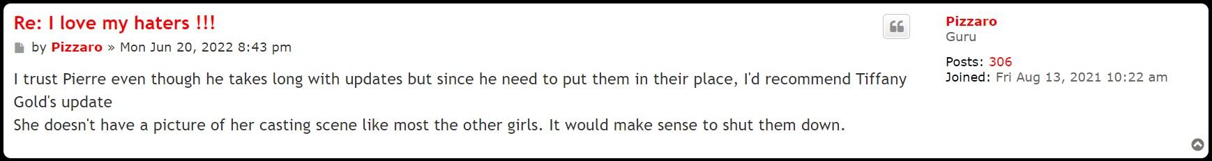 He is calling our bluff now. But you know what the funniest thing is? Recently they called him out for his empty promises and one member clowned him for promising them Nicoline's casting which he made 1000 promises for 10 years and still he didn't do it...but suddenly...now with magic he is willing to make a casting 1st week of July to prove himself that there are videos of all these girls listed and we are lying. When you attack his ego, he will do anything. So easy to get under his skin :D :D :D what a clown this man is. He just proves that he chooses not to give his members what they request although 'he potentially could' but he pretends he makes them happy. Ehst is his members still subscribing for? He basically said he can update any video but he won't give it you whem you want but he will give it pornbox on request necause his so ego is so fragile. What an idiot! :)