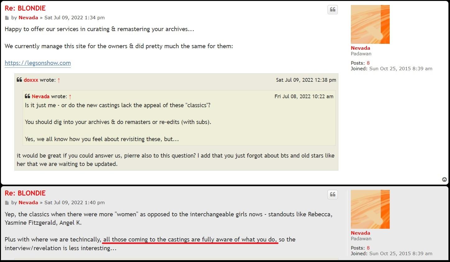 1:05:15 Dan Leal: In Europe there is a certain culture, exploiting these models, like when you do a "casting" and wasn't specific, and badger the models for two hours to do their first anal scene, you'd be in prison in America! End of story. So is the agent. It's called COERCION. It happens regularly here. It's a completely different world.Hmmmm, I wonder who he talks about. Hmmmmm......