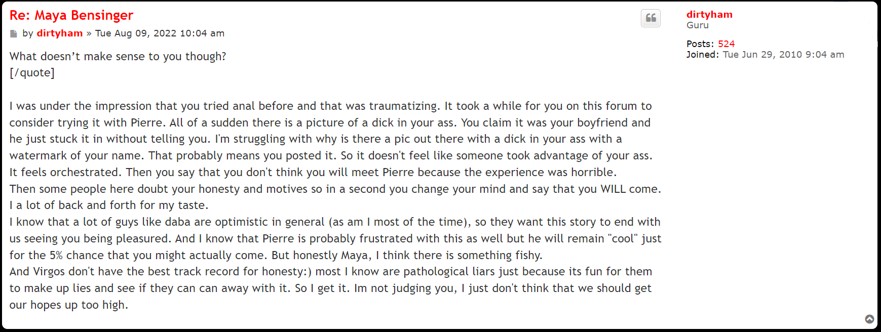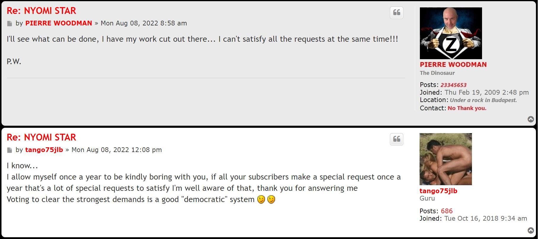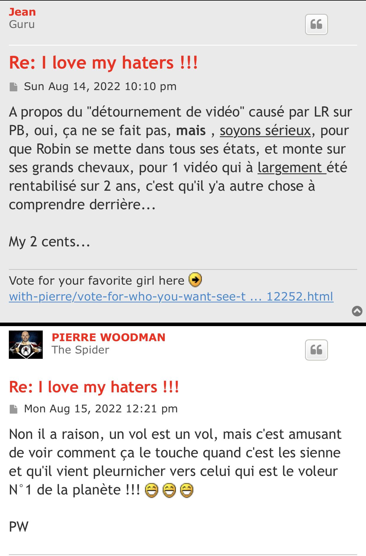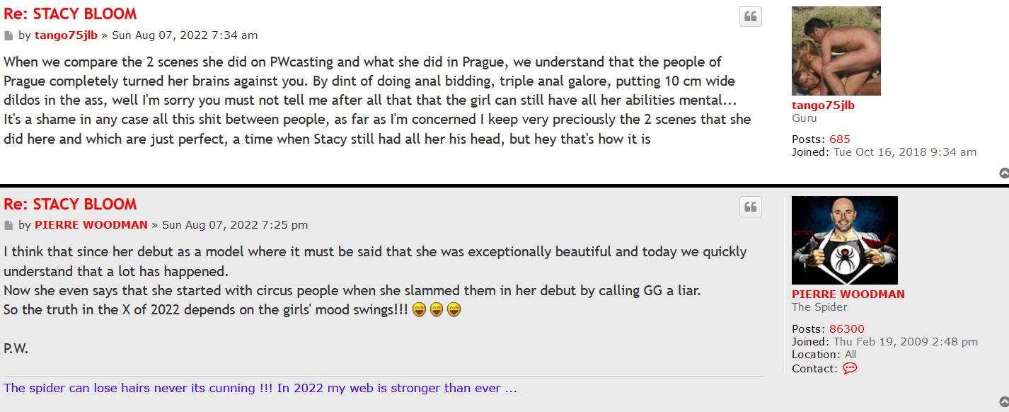 Your thread/topic on his site is a shit show. Be aware that the gross majority of people posting on his forum is gerbier himself. He uses fake troll accounts to fabricate stories and for example help him set up a favourable narrative for his main account pierre woodman. This is because he has no true friends in his life or on forums and because he is a coward who hides behind fake accounts, especially when going after male and females within the industry. For example directors, actors, actresses, agents, agencies etc. He's a pussy.