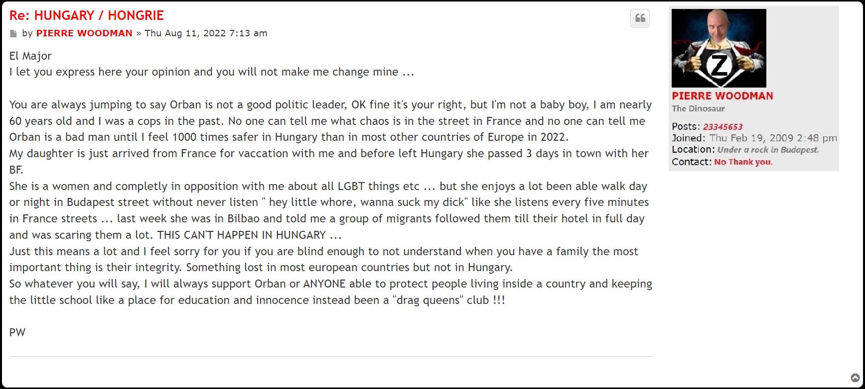 Pierre Woodman wrote: "You are always jumping to say Orban is not a good politic leader, OK fine it's your right, but I'm not a baby boy, I am nearly 60 years old and I was a cops in the past."