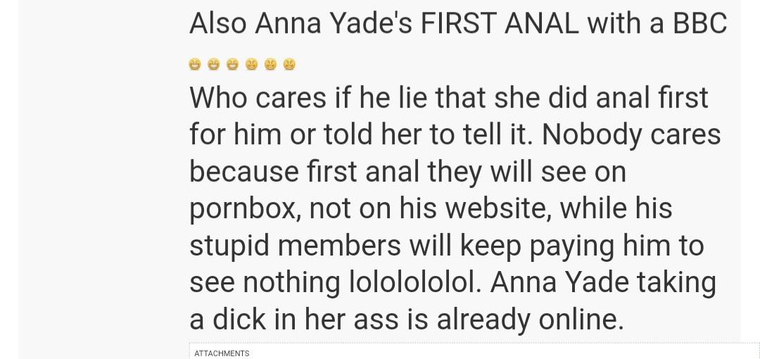 Who cares if he lie that she did anal first for him or told her to tell it. Nobody cares because first anal they will see on pornbox, not on his website, while his stupid members will keep paying him to see nothing lololololol. Anna Yade taking a dick in her ass is already online.