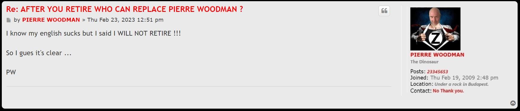 Panorama wrote:I did predict some time ago that Woodman had no intention of retiring when he said. Narcissists can't do without praise from others or self-glory in front of others, particularly one as deluded and arrogant as Pierre. Take all that away from him and he would wither away.