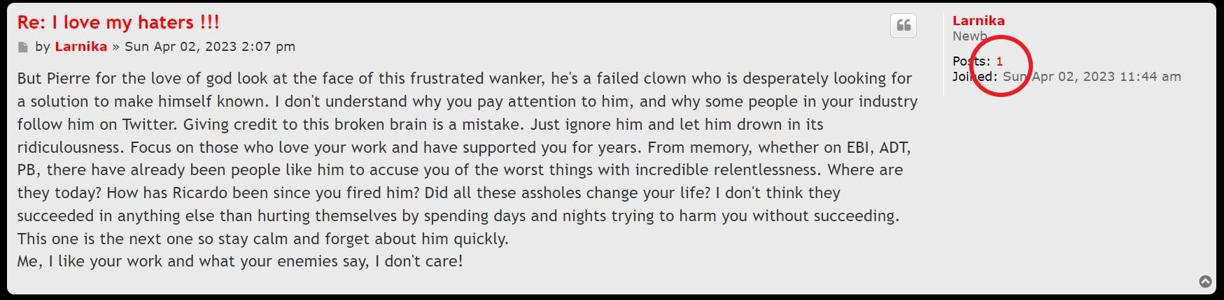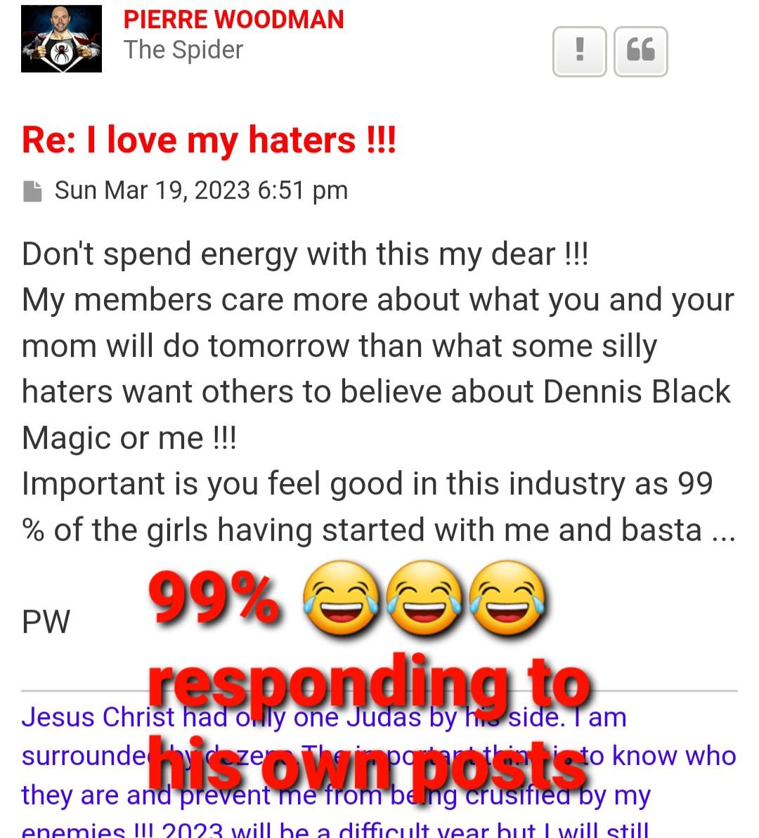 Its so funny he says he loves his haters but he cries everytime about it and the best part is he can't stand when his own members of his own forum can smell his own bullshit and when they call him out, all he can do is to fingers here. What a weak little turd who can't take responsibility for his own forum! Its what weak men do. They cam't sort their own issues so they blame others. Pornbox is to blame for all his problems. The fat ape should be a man and deal with the stupid things he says on his forum and stop blaming us if his members don't want to kiss his ass for the immoral things he does and says