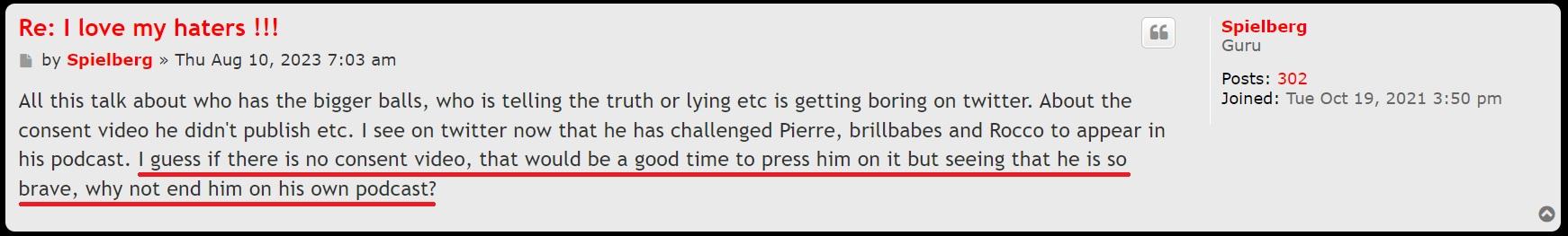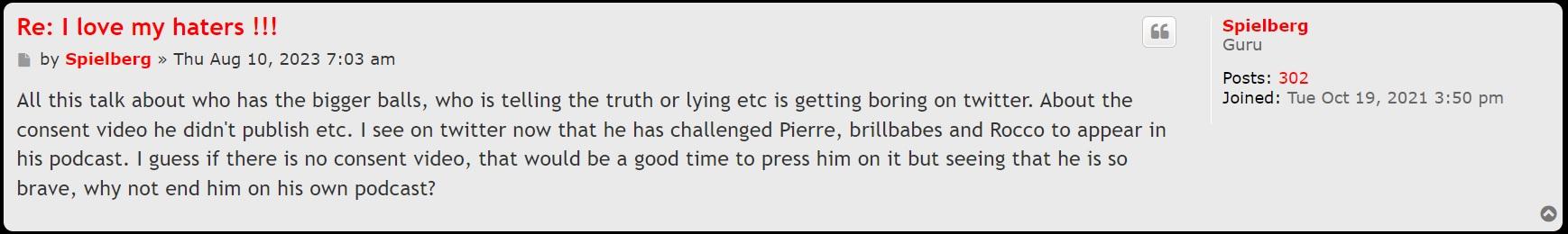 By the way, Pierre, posting my comments on your forum doesn't support you in any way, all it does is prove you never really understood what I was saying, and more importantly, you invite what few members you have left to come here and see the truth about you. One of those truths is the fact that despite all your enthusing about your wonderful life, and how you're going to ruin "Britshit" you still didn't answer or ACCEPT the challenge posed to you by "Spielberg". And don't claim that you wouldn't do it because you think he will "edit" the podcast because I'm sure Tommy would be more than willing to go live with it to quell your concerns.