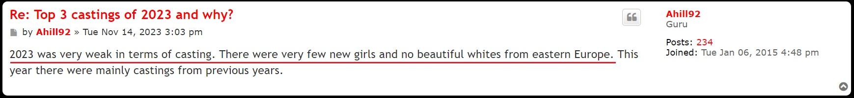 This member states how weak 2023 has been and he's not wrong. Despite Pierre's promises of a great 2023, girls like Buntarka, and Skaya (just to name a few) disappeared quicker than a fart in a hurricane. Of course, we can't forget the video where Pierre was going to show how magnificent he was by slapping down Eva Berger but instead showed himself using fake urine and throwing into doubt his entire "casting" set-up!