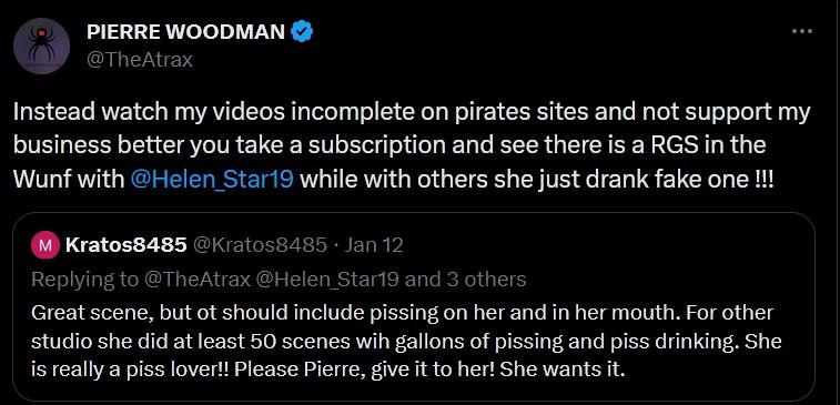 The problem is that PW himself has been using apple juice (so faking things) but he goes around saying that with him it's all 100% real, and that's what he tells to members... so yeah, it's deceving and that's it. And to make matters worse he accuses other productions of faking golden shower.![]()