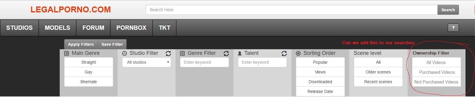 Can we please add a purchase filter to the LP filter system? I often want to go back and look for scenes that I may have missed or not in the mood for at the time but then I have to search through all scenes ever released by LP. It would be nice to be able to filter out scenes I purchased from the Filter mechanism that LP has already provided. Please consider the request as a longtime member I have built up a large collection of purchased scenes and having them clutter the result for the specific scene I'm searching for is a nuisance. :(