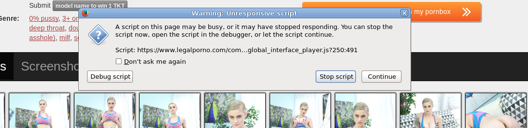 For about 3 weeks now when I first land on a page and press "view all screenshots" the page hangs and I get an "unresponsive script" warning asking me if I want to continue running it or shut it down.
