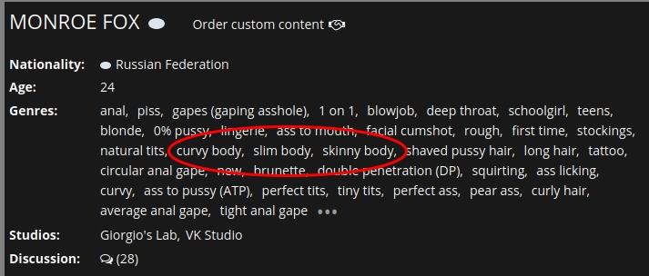 Monroe Fox' body is labelled as "curvy", "slim" and "skinny".