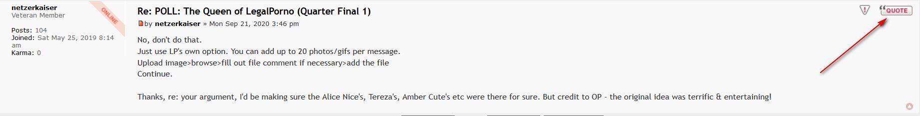 P.S. You can use the quote button you see on the right of a person's post to quote them (and delete certain parts of their message) and respond to them. That way you don't need to do it your way. It's more convenient and less tedious. BTW, if you want to add more than 20 pics in a single message you could add the remaining ones via a fast image hoster. Anyway, it were all just suggestions; just do what is most convenent to you.