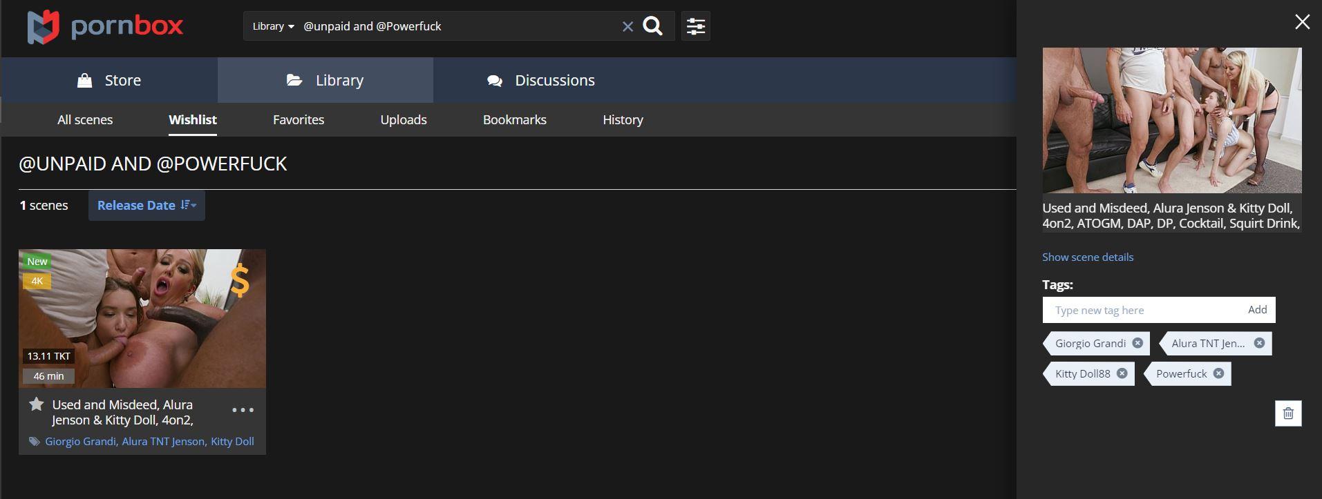 Ultra-Gape wrote:In case it helps anyone, I just thought I'd demonstrate what I mean about user added tags. The scene I tested with above was the most recent I'd bought but here I've added the latest GG scene just to my wishlist to show it works there too. I added the 'Powerfuck' tag to the scene (inappropriately going by the trailer) and then the image below shows that searching for this finds the scene. Click on the attachment to make it larger to see clearly.