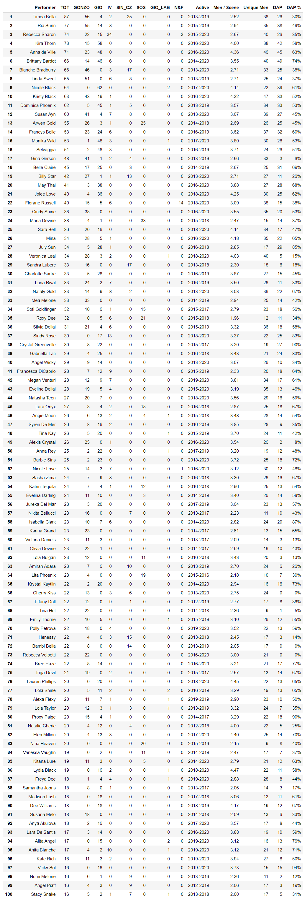 HwtOxc8K wrote:Here's some stats of the top 100 women with the most scenes on Legal Porno.