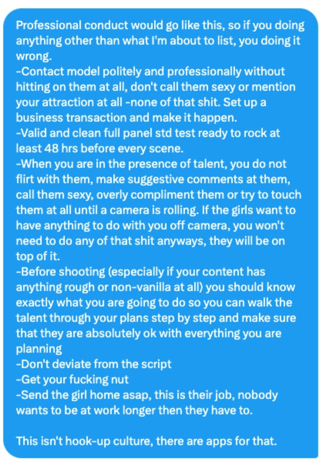I hadn't seen this but it looks like "matter of course". There's nothing shocking in there, it's just baseline professional behavior. I suspect it's largely a response to the way some actresses are treated on set when the cameras aren't rolling - there's often an assumption that since she's there to fuck on camera then she's down to flirt/fuck off camera too. There's nothing wrong with a bit of consensual/reciprocated flirting at work, but this is a dynamic that would build up over time, and you wouldn't flirt or come onto a female colleague without that dynamic/relationship between you, or at least you shouldn't, so the point is you shouldn't on a porn set either - it's a professional environment (or should be).