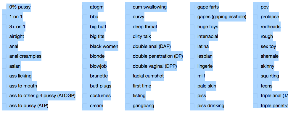 The tag system in these reference images might not contain your particular fetish. That's not why I'm showing it really. It's more to illustrate a different kind of system. Here we have sort of MASTER HEADINGS and there are various options under each one. This is good because you can see at a glance all the things you want. It's more precise.