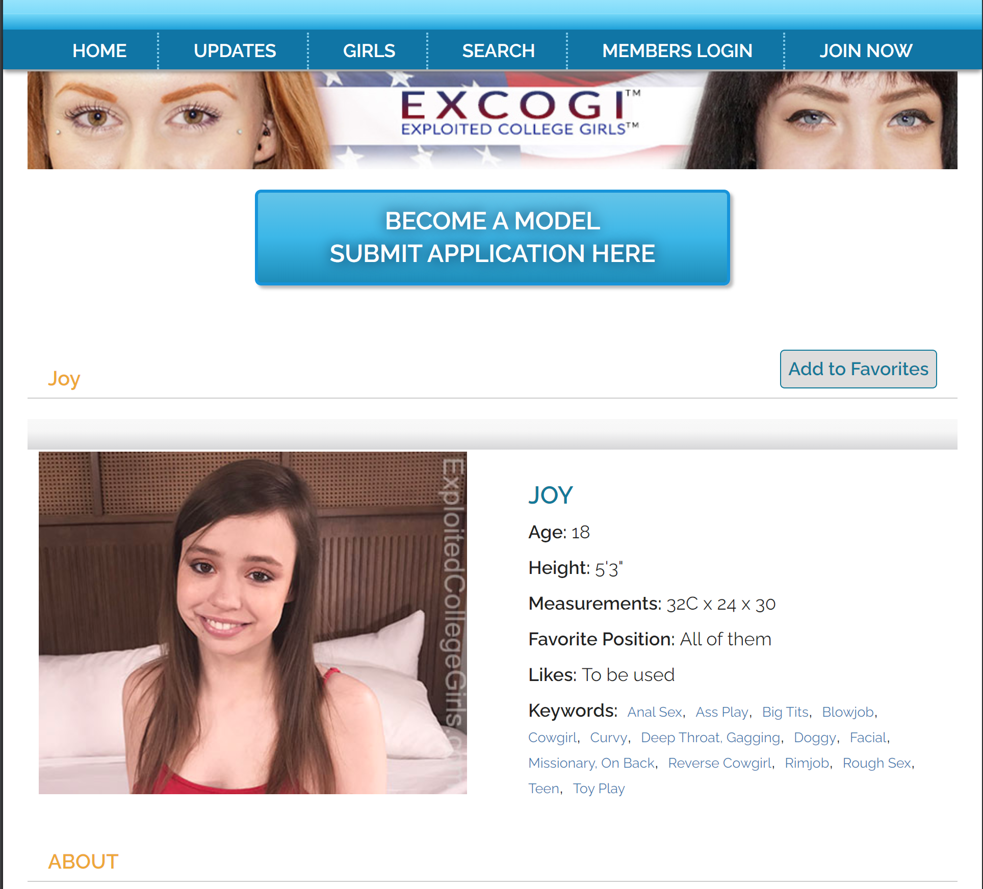 But I found out how Joy was recruited at the Exploited College Girls website. They have a huge recruitment button on every page of their website. This button says "