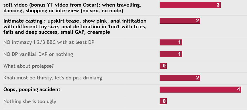 then, I decided to display options according to what I saw in the forum threads. I'm not attracted at all by DP/DAP/prolaps/piss (light pooping accident can be funny) Even if I don't like, I wish to be faithful to PB members desires.