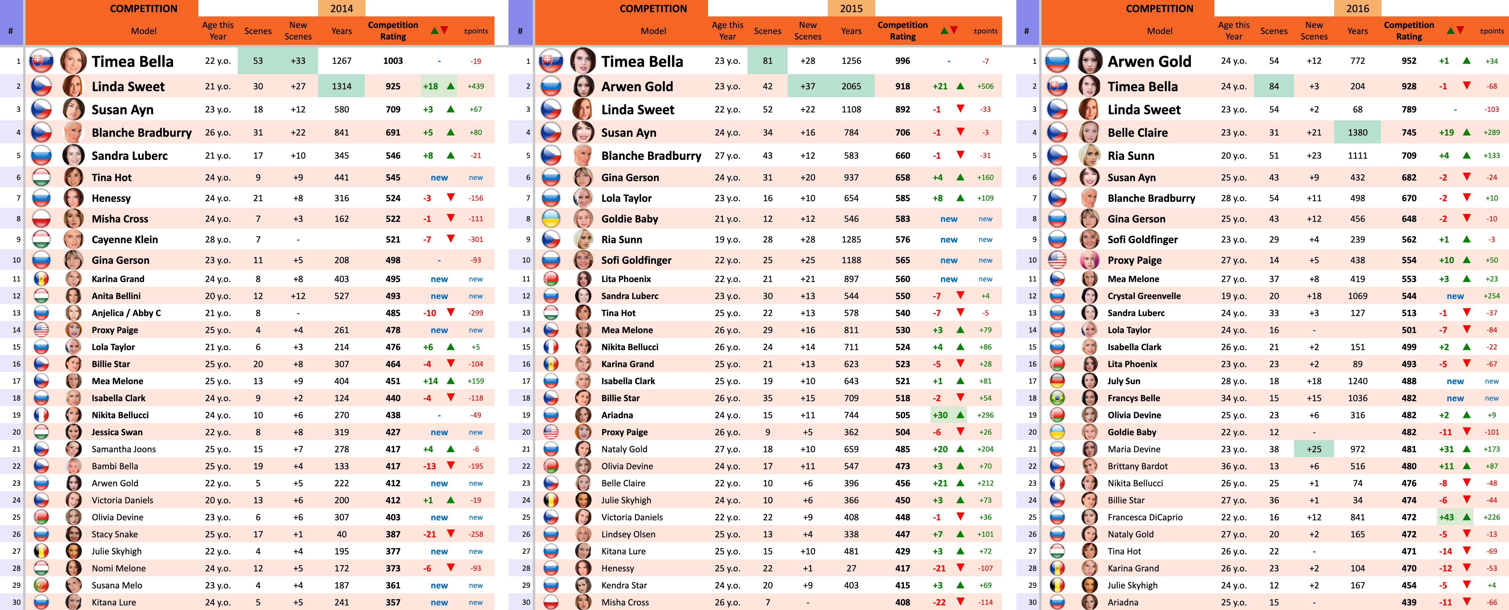After three inactive years Arwen finally dropped out of top-5, Timea held 2nd place in 2019 but after inactive year also dropped out, as well as Ria Sunn and Belle Claire.